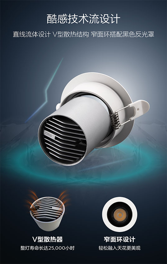 • Cool technology flow design: linear fluid design, V-shaped heat dissipation structure, narrow face ring and black reflector